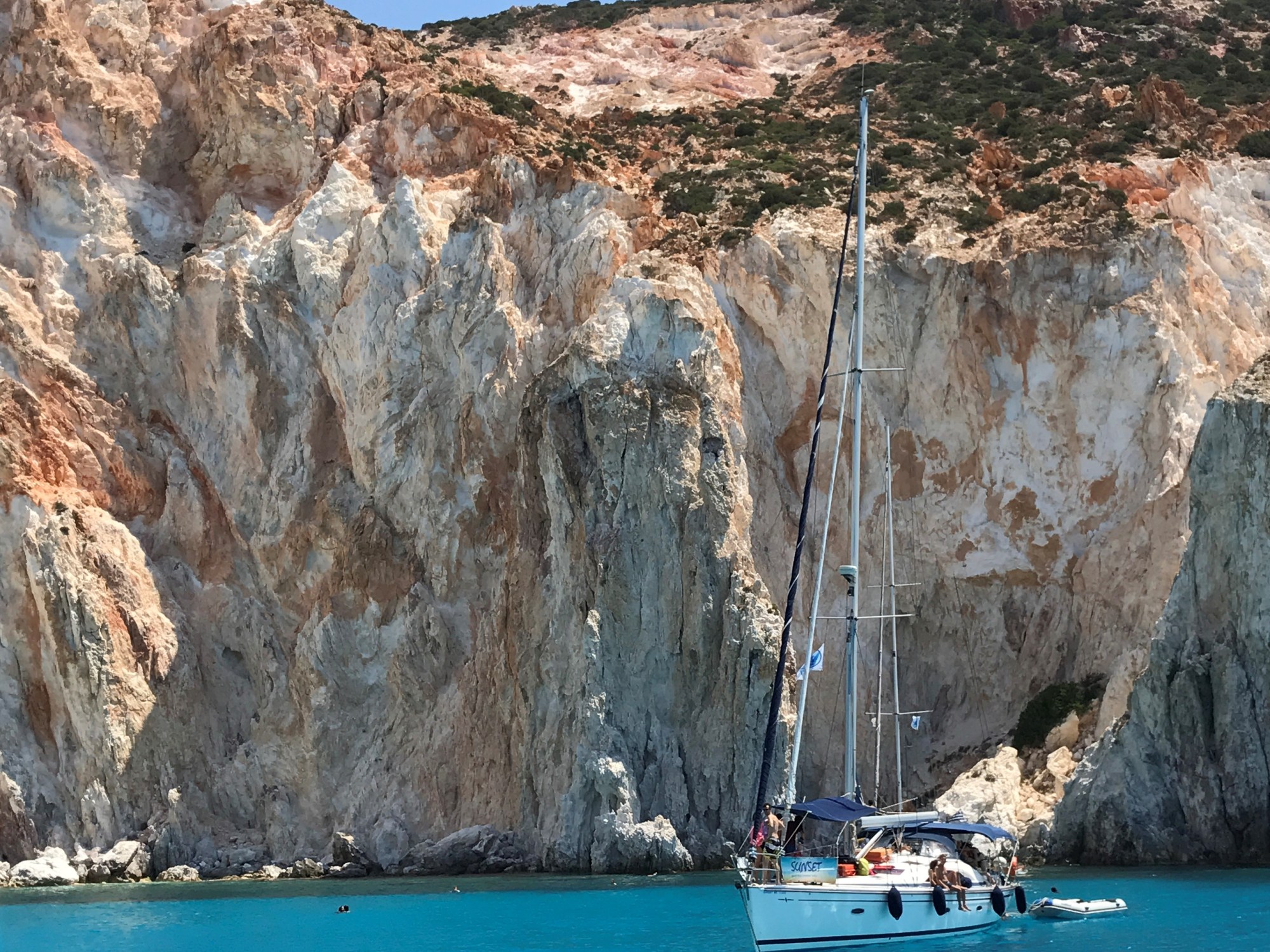 If you visit Kimolos, don’t miss (repeat: don’t miss!) a day-trip to the neighboring uninhabited island of Polyaigos. It is breathtaking. Several companies in the port of Kimolos offer this one-day tour and most include lunch and beverages. The boat stops at several scenic spots along the way allowing you to swim and take in the immense beauty.